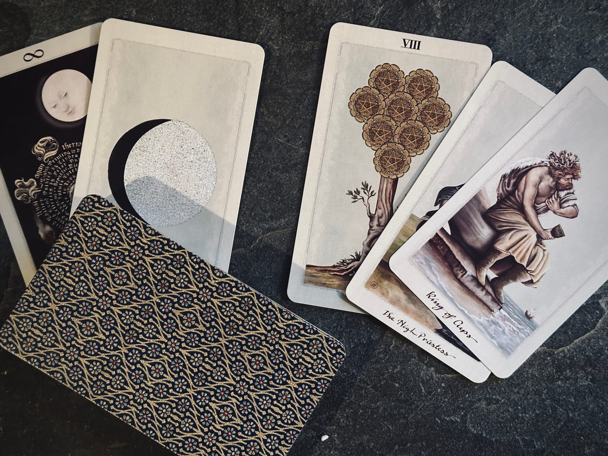 Despite this, my overall consensus remains positive. The deck includes the added card of The Seeker (partially pictured above on the far left with the infinity symbol). I often use a signifier card in my readings, and this card is a much welcomed addition. It resolves the issue that some practitioners have of removing one of the standard 78 cards from the deck to use as such. Also, the deck incorporates five lunar cards, representing the new or black moon, crescent, quarter, gibbous, and full moon phases. I noticed that these phases can represent different times within the lunar cycle, depending on whether the card appears upright or reversed — for example, first or third quarter and waning or waxing crescent. Over the past eight years of reading Tarot, I have hardly ever used reversals; however, this deck might be one of the two decks I own that will defy this practice.